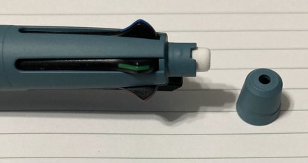 ↓続いてキャップ部分ですが、消しゴムが中に入っておりキャップは取り外しする際、内部に凹凸があるので「パチッ」と音が鳴りしっかりとキャップがはめ込まれるので紛失しにくくてかなり良いです。それでも無くしてしまったという人のためにキャップだけの販売もしているそうです。流石は三菱鉛筆様。この情報をX(旧Twitter)の投稿で見た際はキャップ無くしたわけでもないのに物凄くありがたいと思いました。(もしキャップ無くしても安心なので)