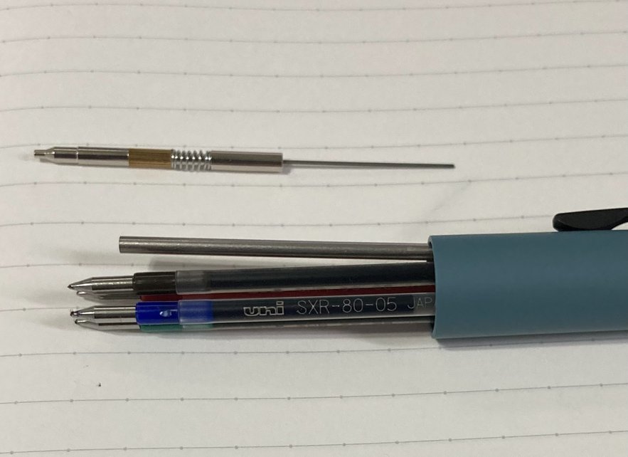 シャーペンの芯を交換する際は下の写真の様に、一度分解してシャーペン軸の先を引っ張ってシャーペン軸(銀色の軸の部分)に芯を入れるというやり方です。私はこのペンでシャーペンを使うことがほぼないのですが、このペンで「シャーペンもガンガン使っていきたい」と考えてる方にとってはこの交換方法は面倒かもしれません。